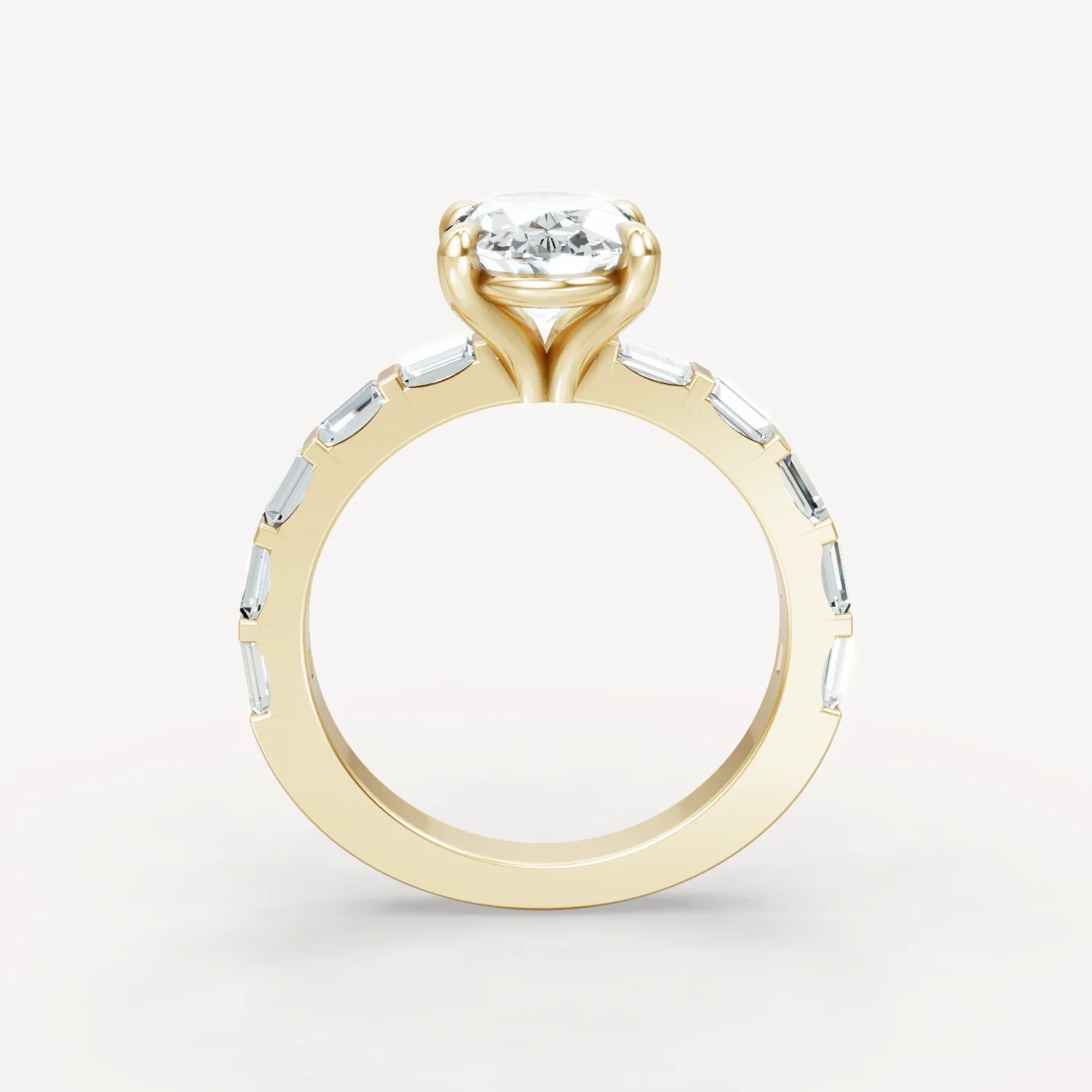 This unique engagement ring showcases a Truly Exceptional™ center stone of your choice. The band features east-west set baguette accent stones (approximate carat weight total of 2.00), creating a bold and modern look. Available in 14k yellow gold, white gold, rose gold, or platinum, this ring will stand out with it’s rare and memorable design.