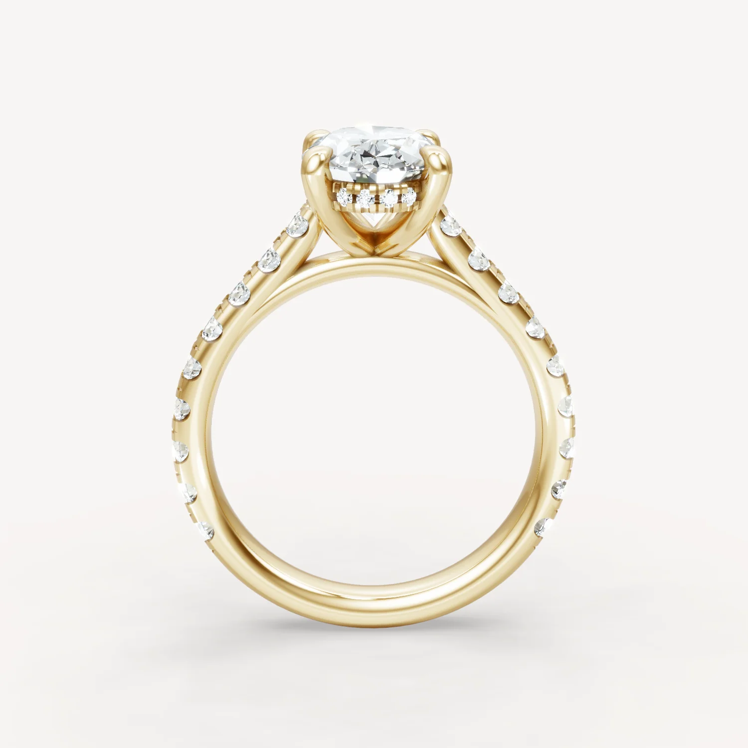 This stunning cathedral engagement ring features a hidden halo and accent stones (approximately .51 carats total weight), with larger round stones for added brilliance and presence. The graceful cathedral setting adds height and elegance, perfectly showcasing the center stone in a timeless yet striking design.