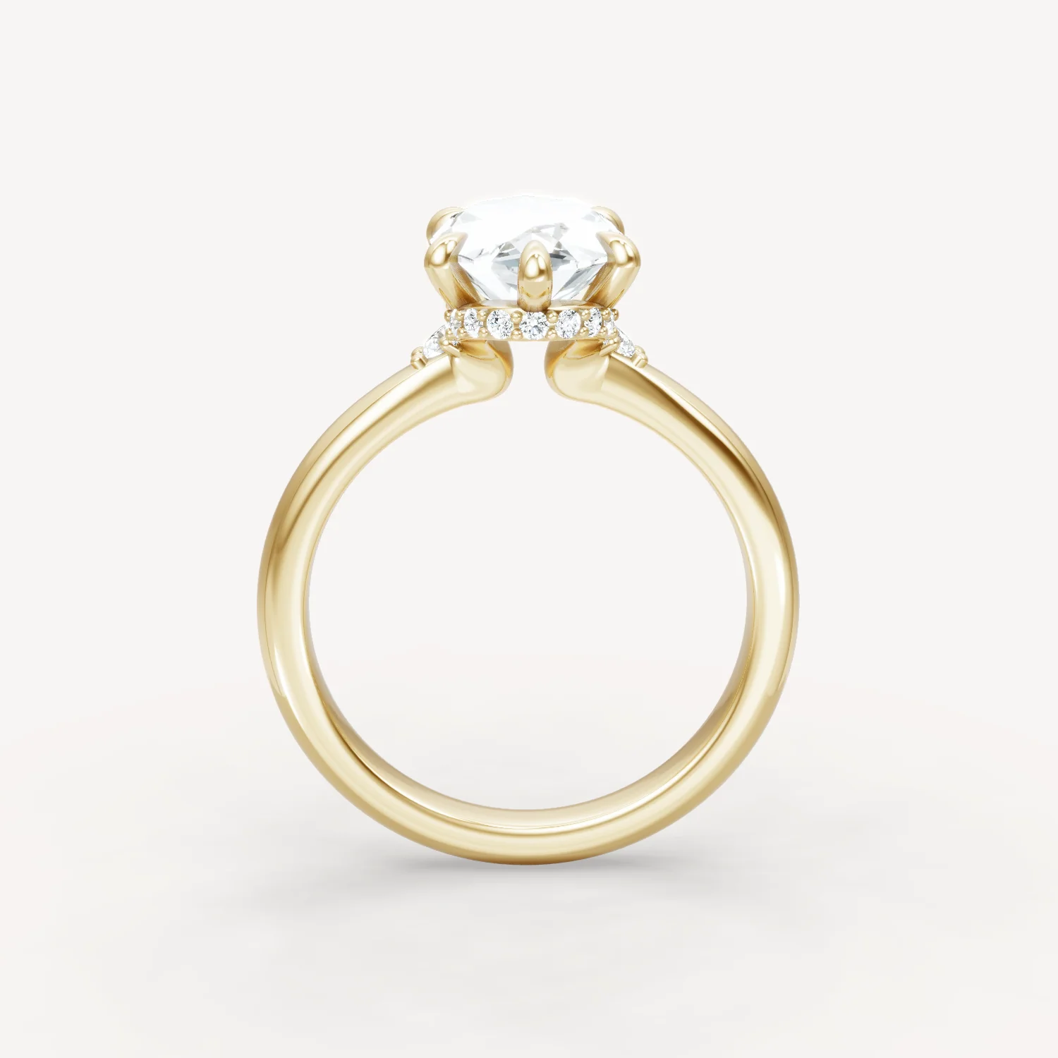 This beautiful engagement ring features a distinctive hidden halo design that elegantly cradles the Truly Exceptional™ center stone of your choice, creating a floating effect. The open shank is delicately accented with pavé accent stones and a larger round stone on each side (approximately 0.02 total carat weight), enhancing its brilliance from every angle. Available in 14k yellow gold, white gold, rose gold, or platinum.
