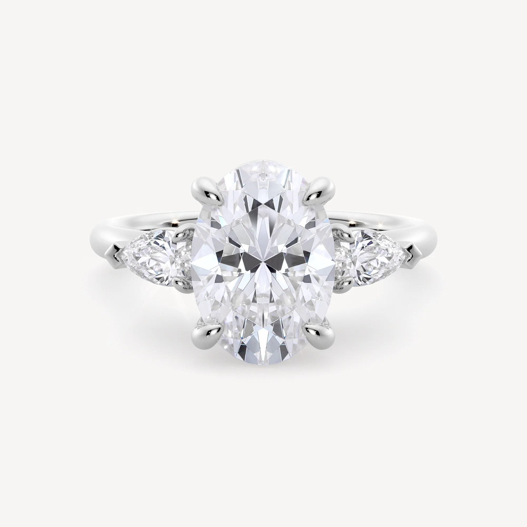 - Pear-Cut Side Stones: Flanking the oval center are pear-cut lab-grown diamonds, adding a touch of whimsy and elegance, and completing the trinity of your love story.